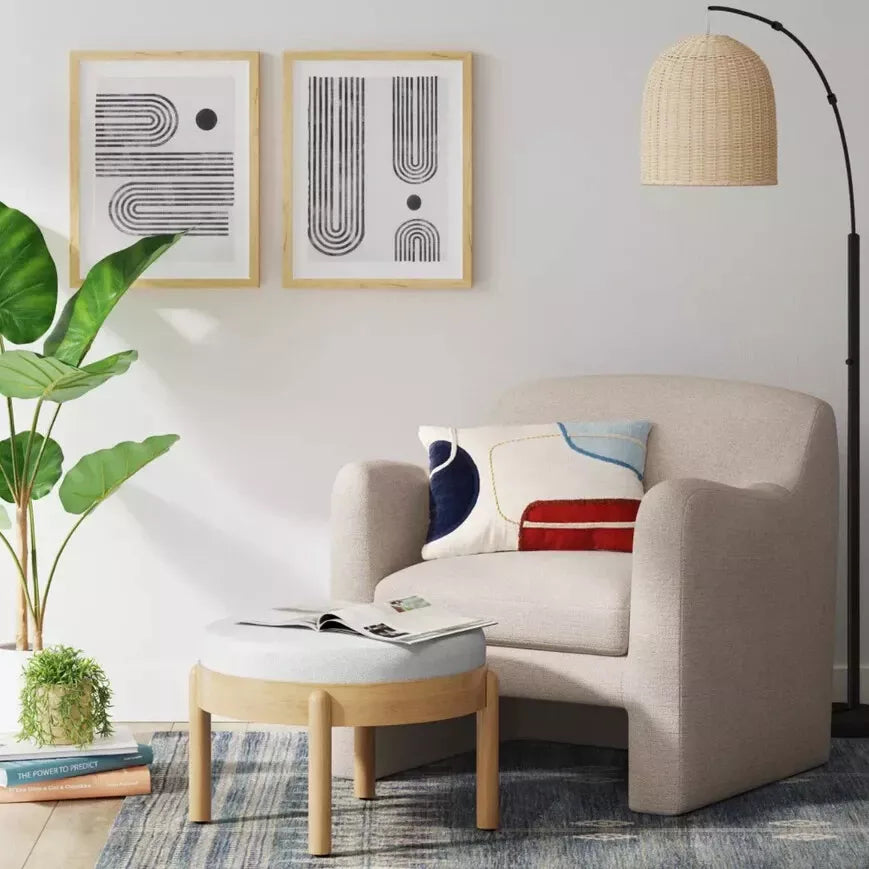 Bring an extra boost of comfort and understated style to your home with this Reedsville Dowel Ottoman from Threshold. This upholstered ottoman boasts a clean-line wooden frame that’s beautifully accented by a velvet-look cream cushion, adding a sense of depth, dimension and texture to your living space. Plus, the round ottoman can act as both a spot to sit and a decorative accent piece. Simply place it in your living room for casual entertaining or an accent chair to kick up your feet after a long day, or keep it in the entryway for a quick seat you’re sure to appreciate.