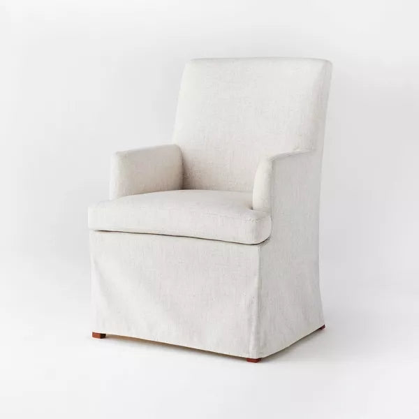 Make your dining space as comfortable as your living room when you arrange some Upholstered Slipcover Dining Chairs from Threshold™ designed with Studio McGee around your dining table. With its padded back, seat and armrests, this upholstered dining chair has the appearance and feel of an armchair for a seat that'll keep you comfy through long meals or during pleasant post-meal conversations. The wooden frame is kept hidden by a slipcover that extends to the floor for a clean, polished look. Plus, it comes in a simple cream color that's easy to coordinate, looking just as good complementing tableware in other neutral hues as contrasting brighter, bolder colors.